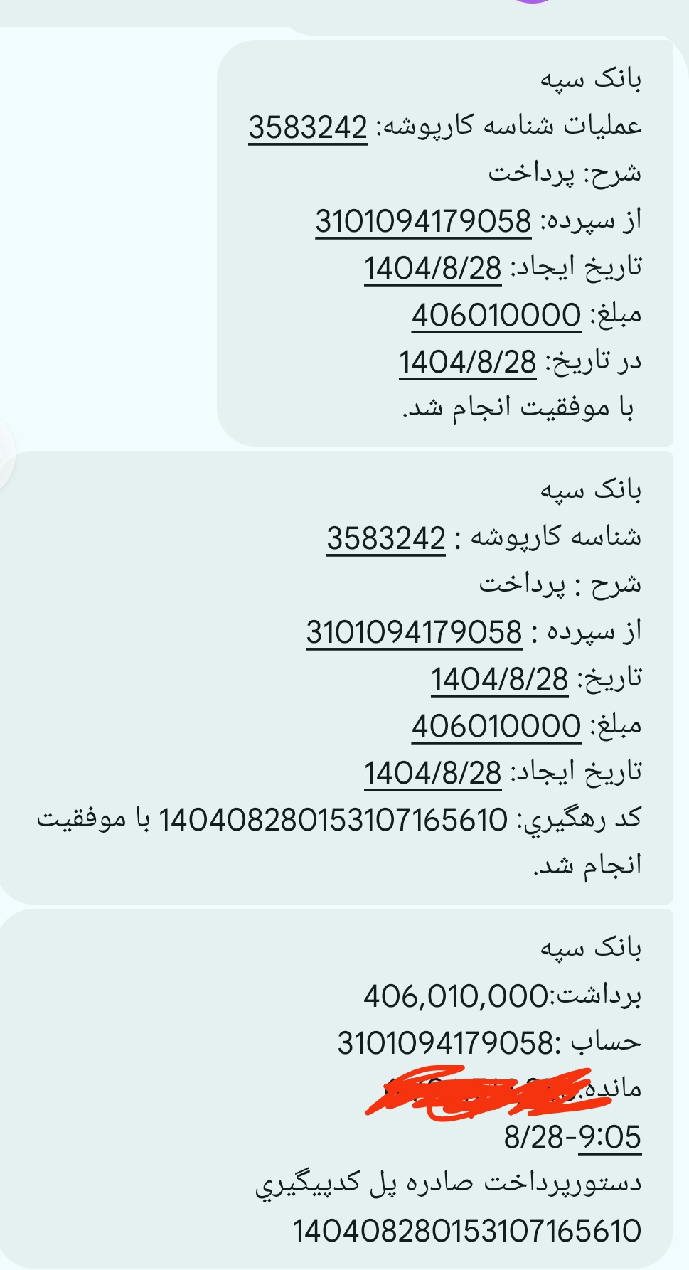سلام وقت بخیر من امروز ۱۲ هزار لیر شارژ کردم و به حساب شما شبا کردم ولی به دلیل مشکلات اینترنت بانک سپه به بنده فیش نداده و پیامک برداشت از حساب رو برای شما ارسال کردم البته دارای کد رهگیری و مشخصات حساب مقصد است لطفاً چک بفرمایید و بعد از واریز وجه شارژ را اعمال کنید ممنون