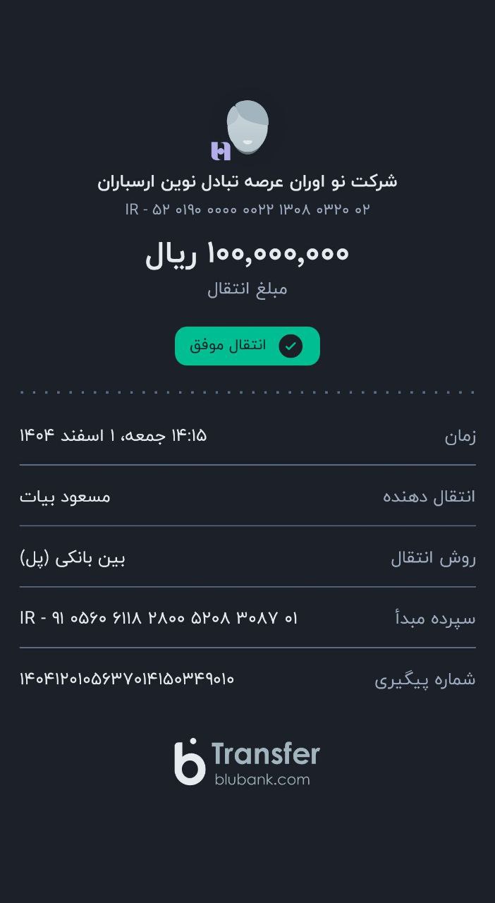 در رابطه با پرداخت به شماره شبا هم باید خدمتتون عرض کنم که انتقال با پل که سریعترین حالت هست هم همون لحظه فیش واریز نهایی نمیده ۱۴۰۴/۱۲/۰۲ ۱۱:۴۶
